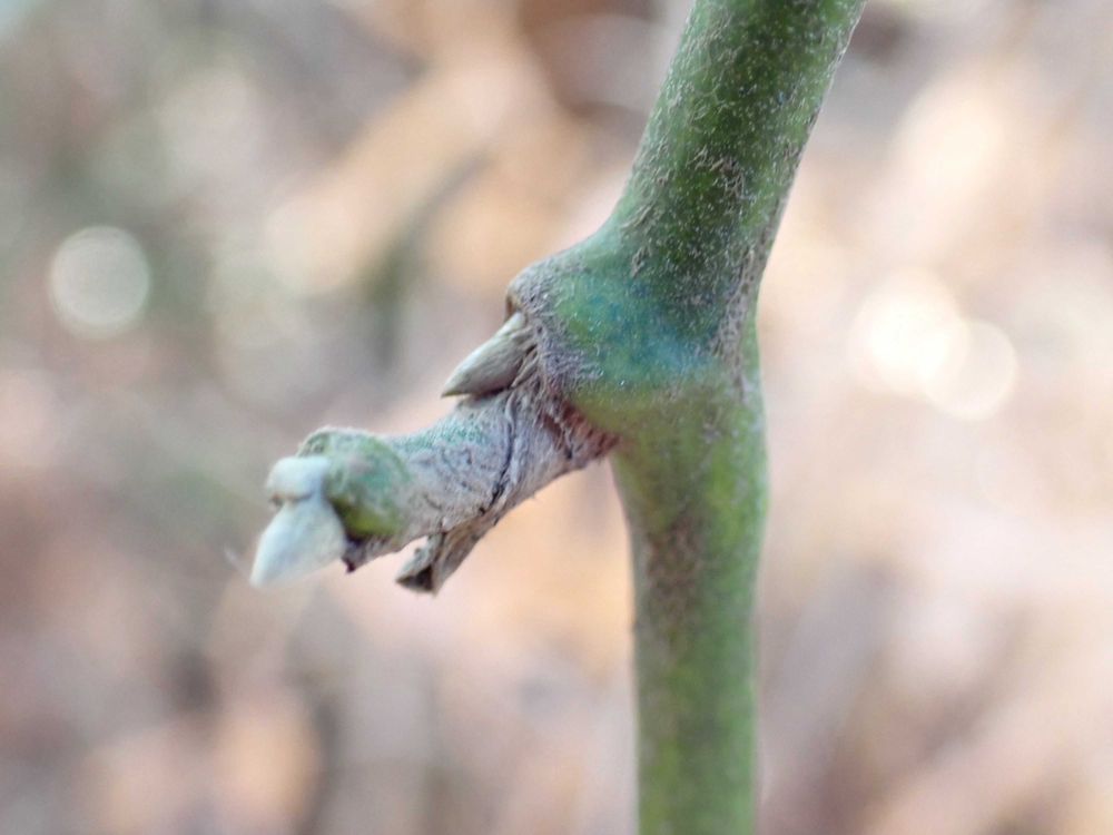 冬芽は、白っぽい毛に覆われています。主芽も、その下の予備芽も、尖っています。葉痕は、V字形で冬芽を取り囲んでいます。維管束痕は、3個でした。