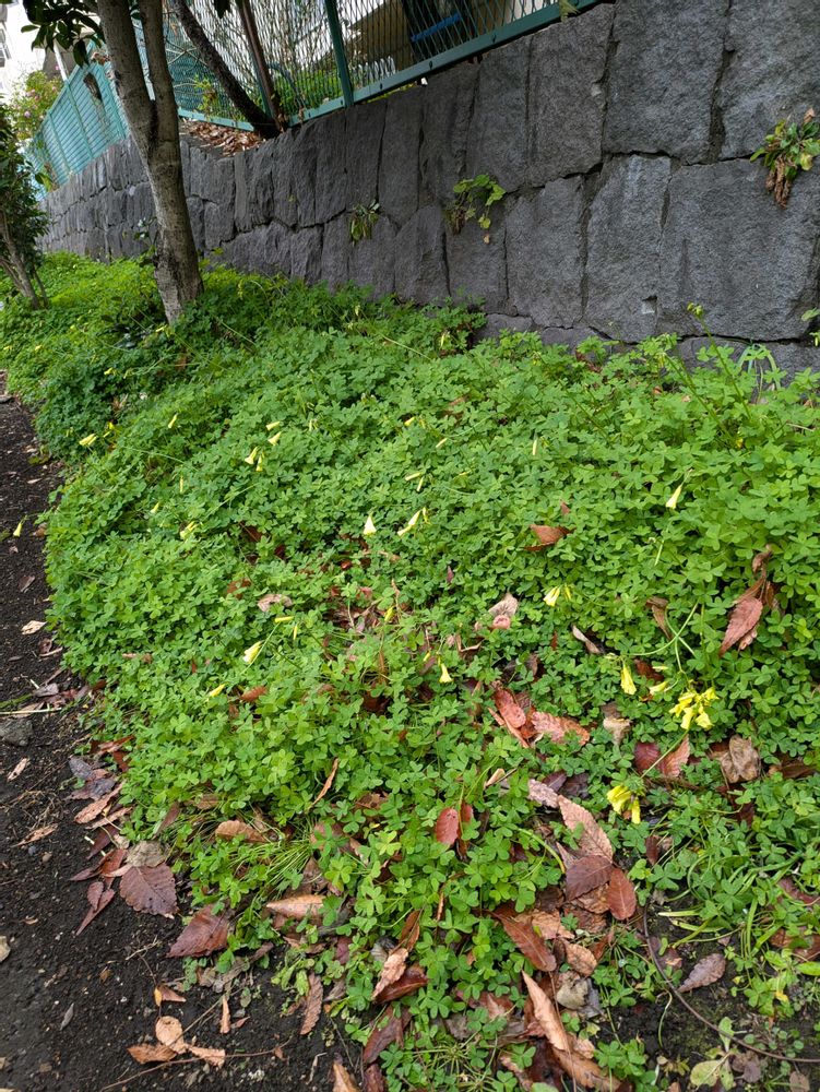 歩道に黄色の小さいらっぱに形の花が、葉は四つ葉のクローバーと同じてして。