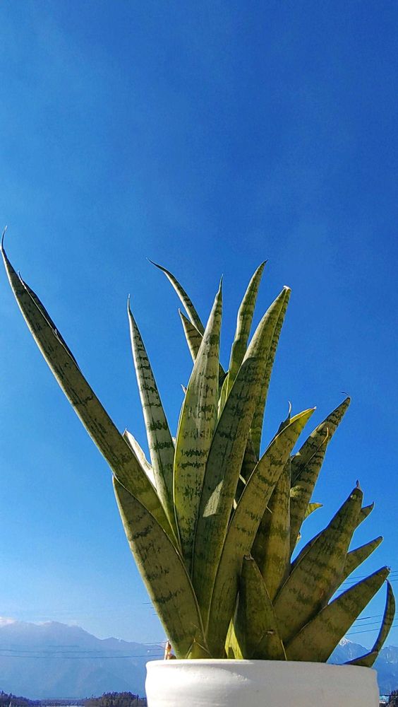 爽やかな装いを見せてスクスク育ち、青空に向かって華やぐサンスベリア素敵です(^o^)v🎵😀