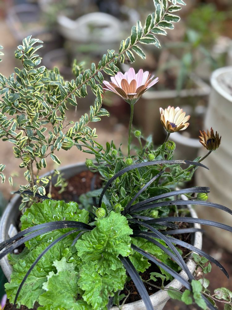 この寄せ植えは丁度後ろが枯れて空いていたのでそこにオステオスペルマムを