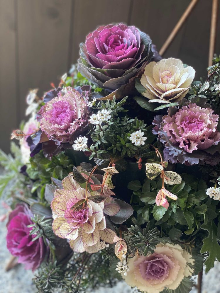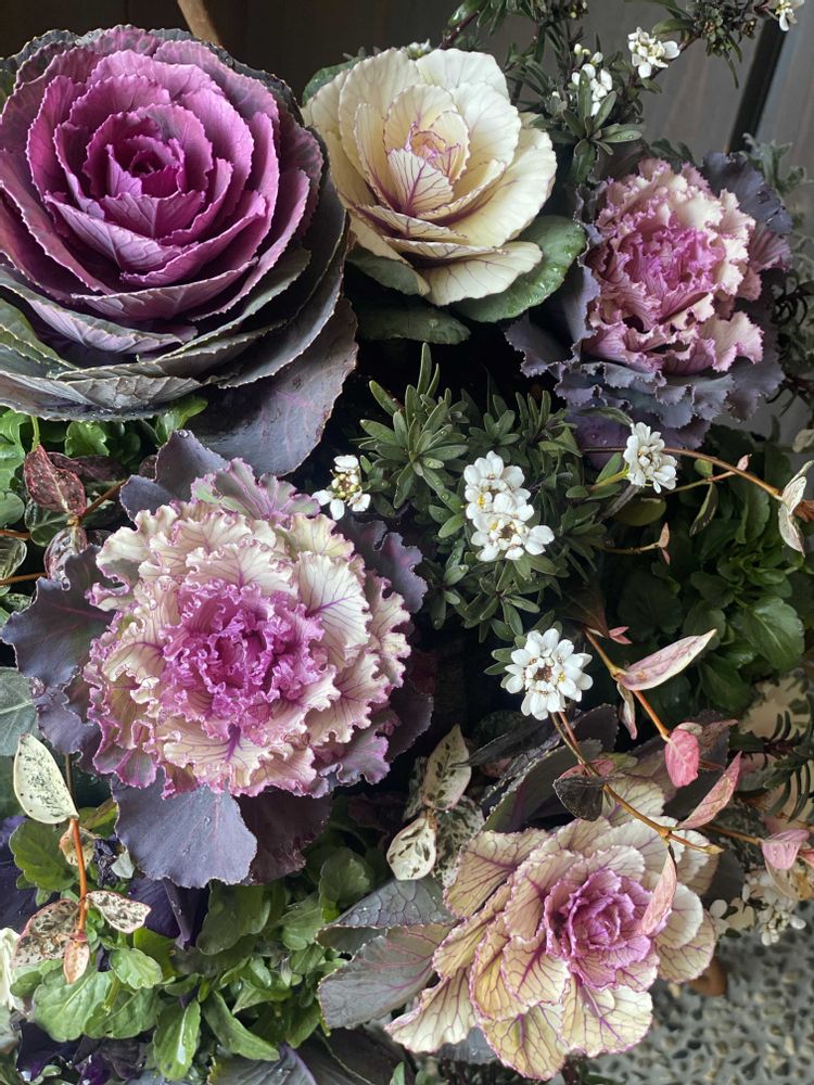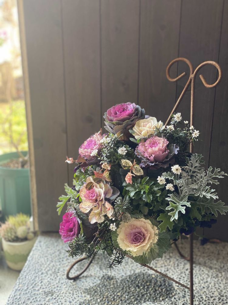 年末に勢いで寄せ植え教室に申し込みしてつくった葉牡丹ハンギング