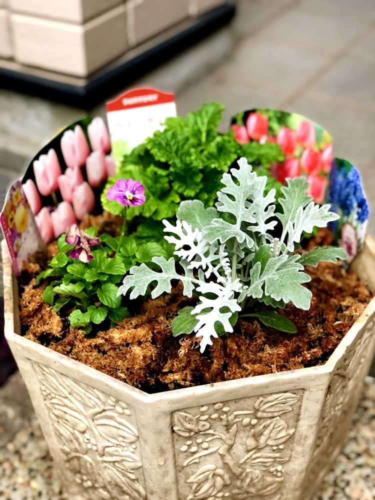 チューリップ🌷ムスカリの球根を入れて、春には花束💐みたいな寄せ植えになりますように🙏😂