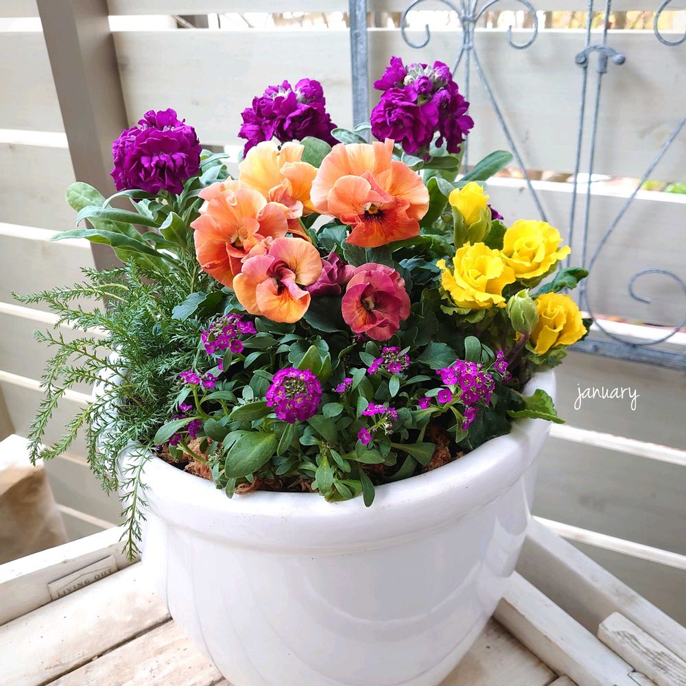 春マンボーが華やかになってきたので思いっきり明るい寄せ植えを作ろう!とカラフルなプリムラやストックと一緒に寄せ植えしてみました。
