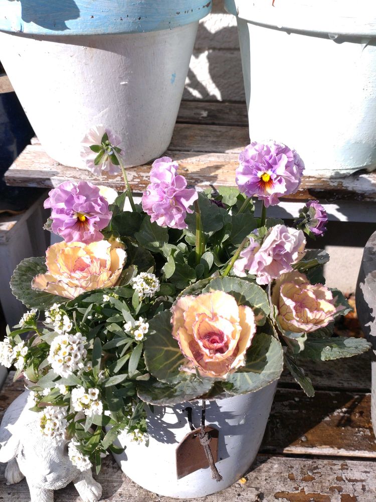 寄せ植えの葉牡丹、ピンクだったのに白くなりました😅