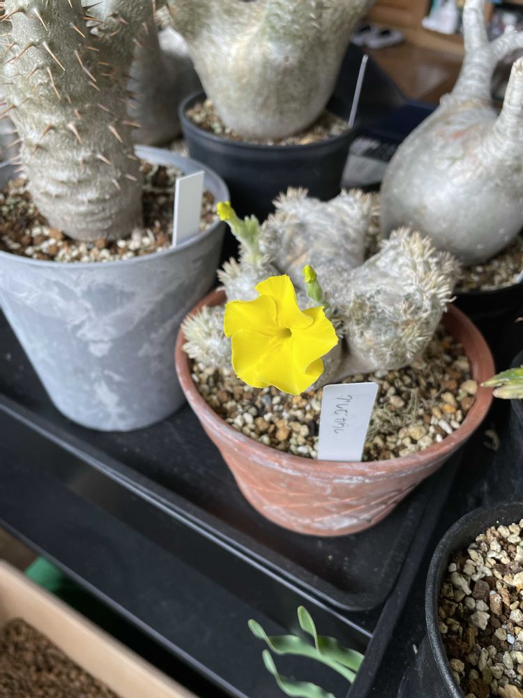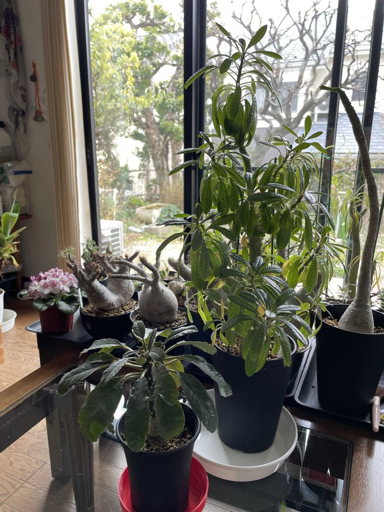 恵比寿笑咲きました😊お日様に当てているので花茎が短くて感じが良い🙆ドルステニアは全然葉っぱ落ちないですね。今年は暖かくしてるからかも?滝の白糸はデカくなって周りの植物を刺すので単独隔離中です😓