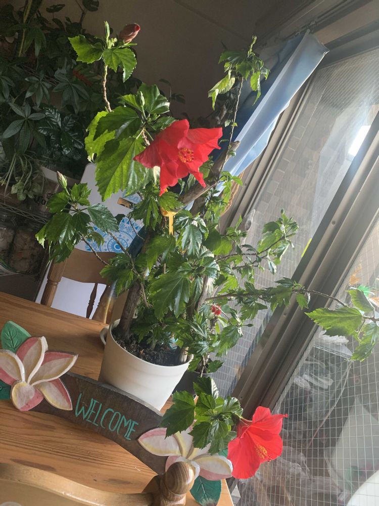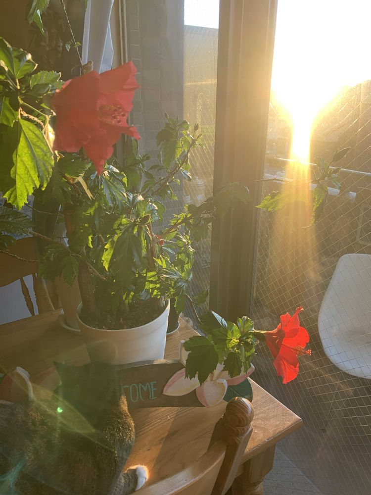 朝から日差しを浴びて幸せそうな我が家のハイビスカス🌺から元気を届けるね☺️