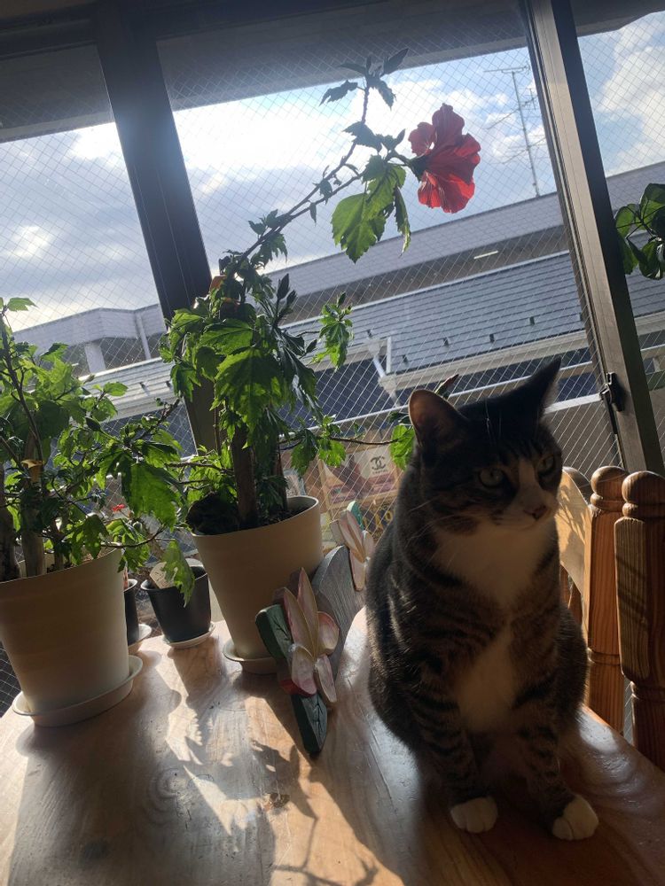 こんばんは😊ハイビスカス🌺もプア🐱にも癒されて幸せだよ😊早く帰りたい笑