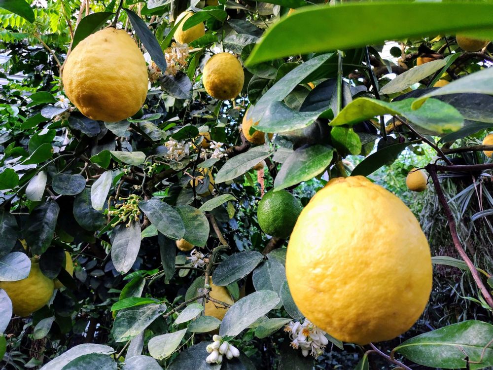 今日ははこの温室で一番目立っていたレモンの「ポンテローザ」という品種でたくさんの実が成っていてお花も咲いていました🍋