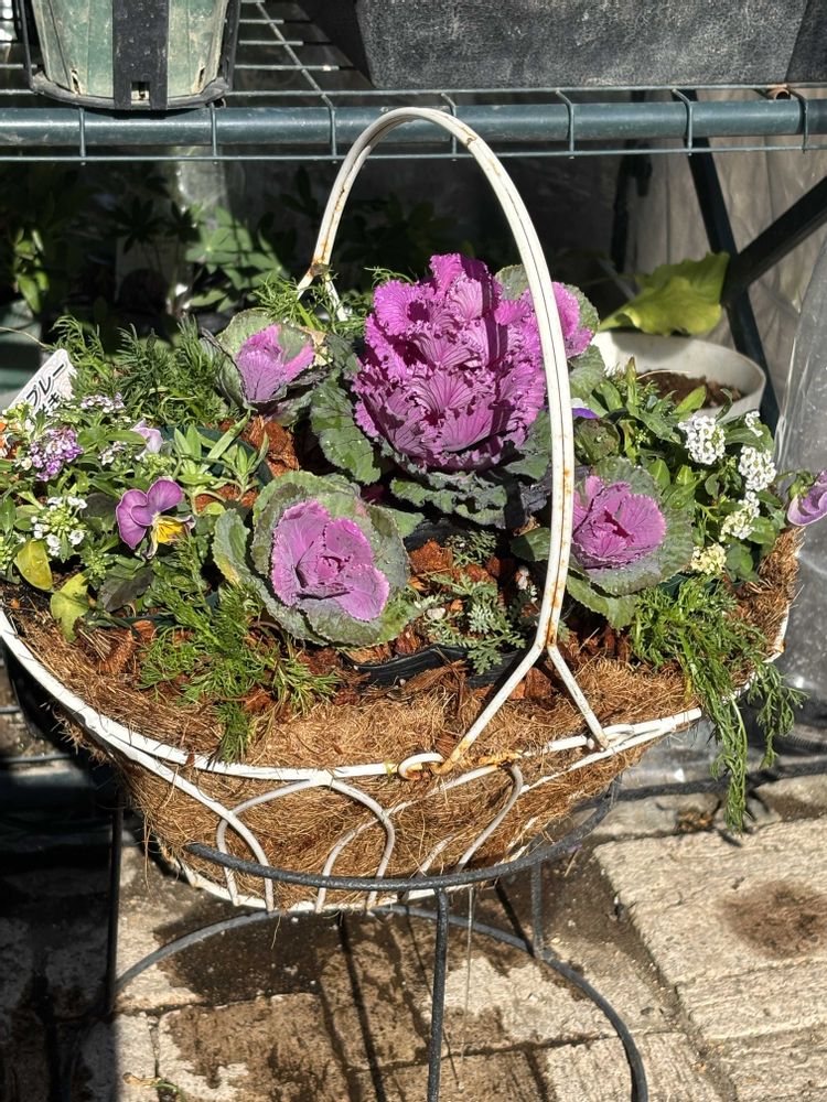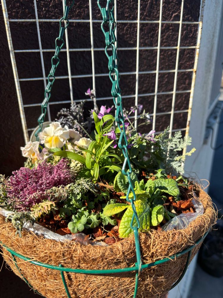 プラ鉢に植えてた葉牡丹、なでしこなどを入れて、直にカモミールやスプレー葉牡丹をべラボンに植えてみました。