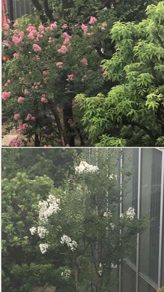 会社の渡り廊下から下のお庭で咲いてるサルスベリ、ピンクと白があります(╹◡╹)♡