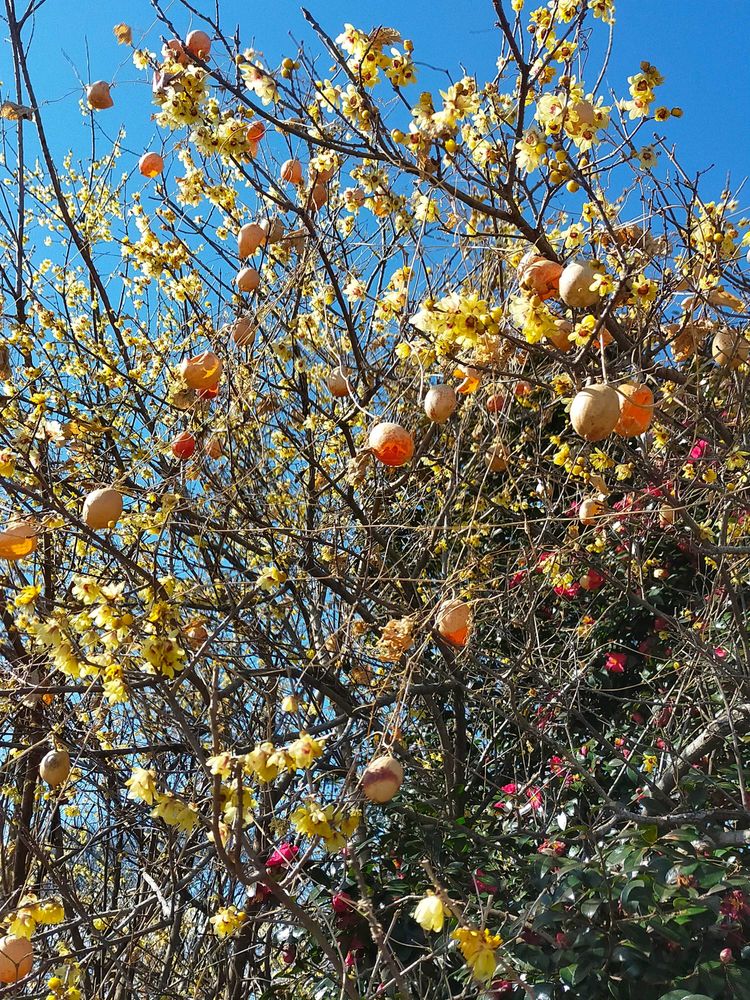 蝋梅にみかん!?いえいえ、からみついて乾燥したままのカラスウリです。