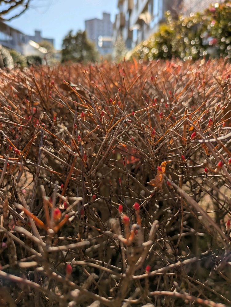 角刈りされた植栽のドウダンツツジの紅い冬芽を覗きたくなりました。