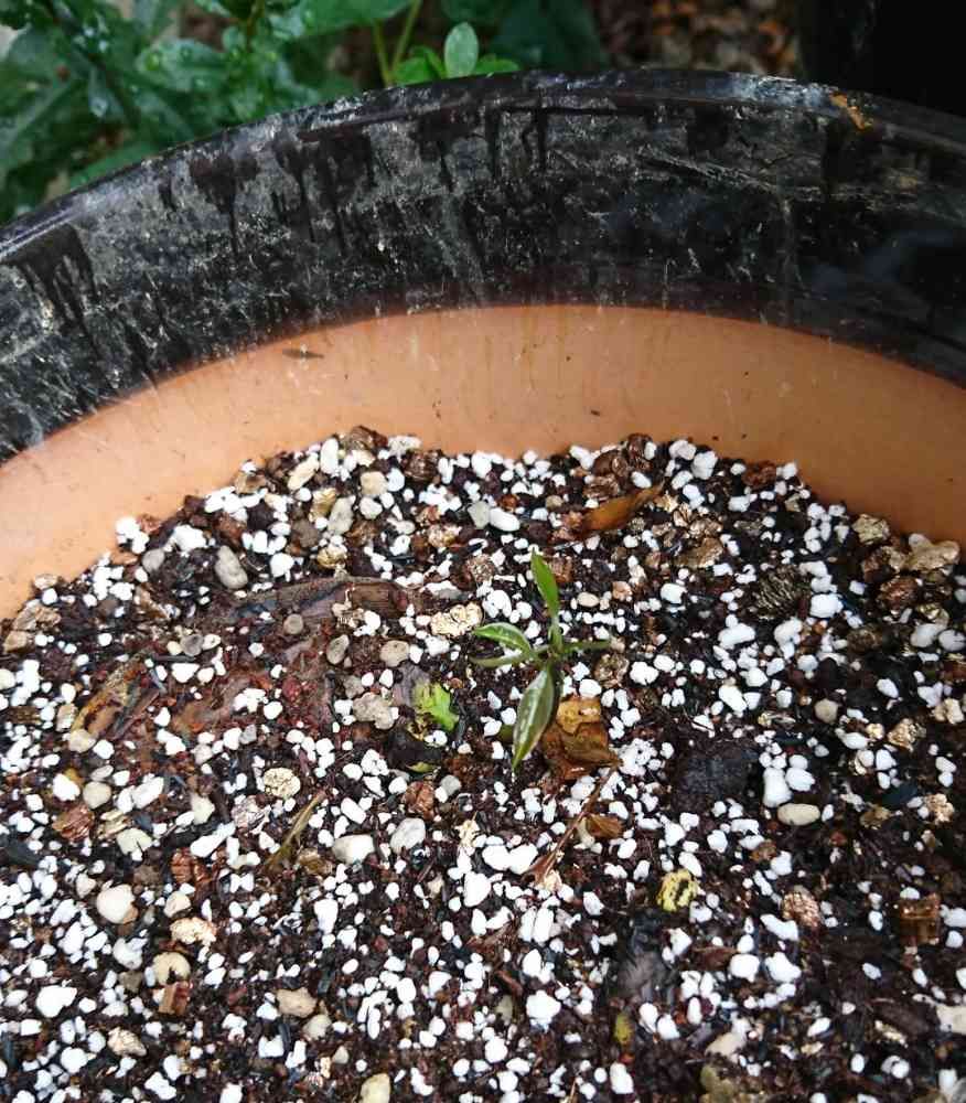 スマホ撮影だから、わかってもらえるかしら。コストコマンゴーの種から芽が出ています。消えてしまいそう。