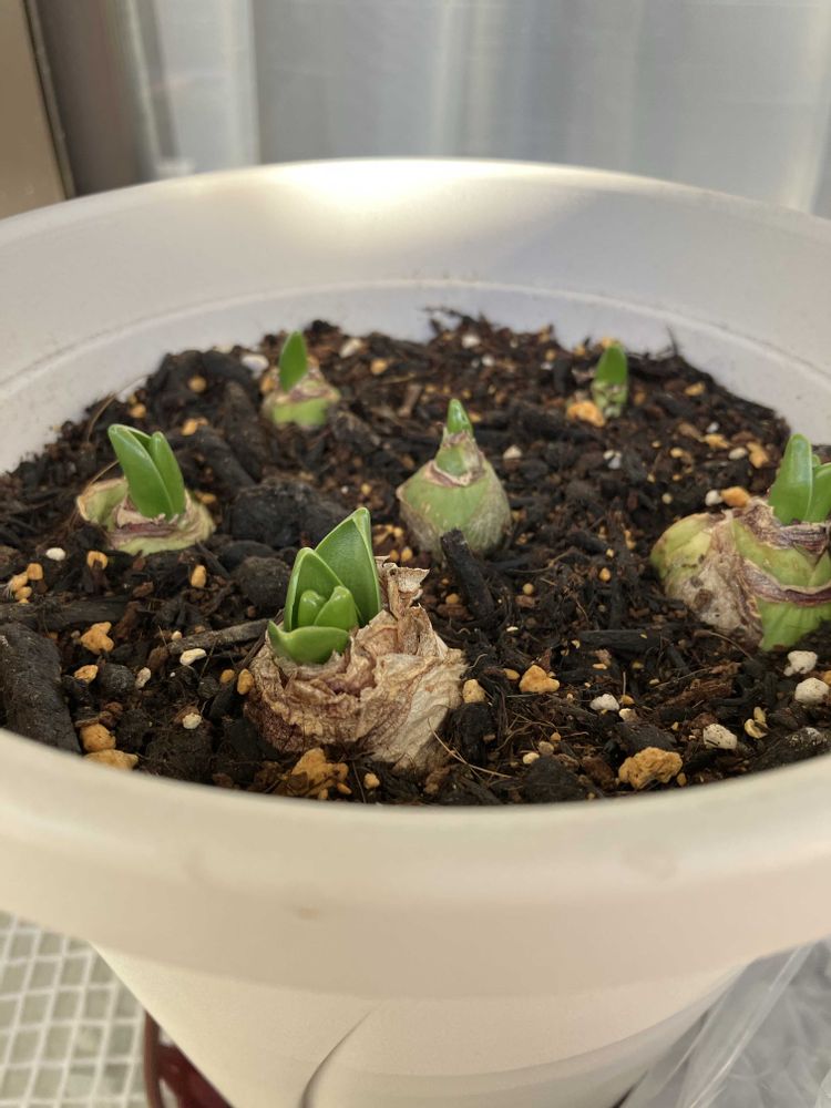 ヒヤシンスもチューリップも可愛い芽🌱が出て来ました