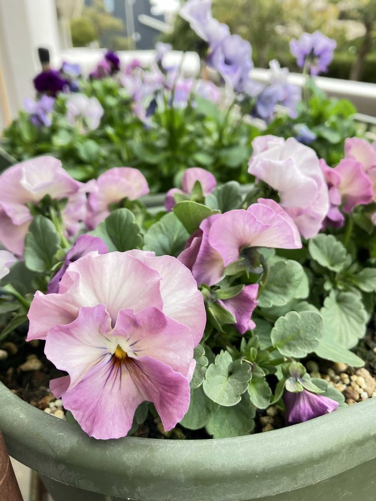 ピンクのビオラ側から撮影。11月から次々咲いてくれるビオラたち。冬のベランダを華やかに彩ってくれています。