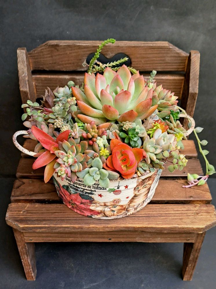 私は、一応正面決めて、メインの多肉を中央に置いてちょっとメインより小さめサイズを十文字に配置🤭