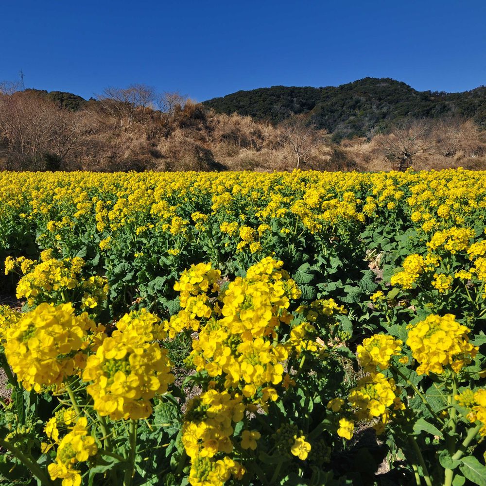 千葉県安房郡鋸南町では食用菜花の生産が盛んです。収穫が終わると一面黄色い絨毯になります。早くも菜の花畑の出現です。
