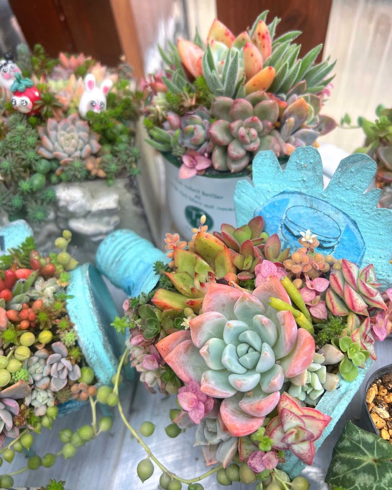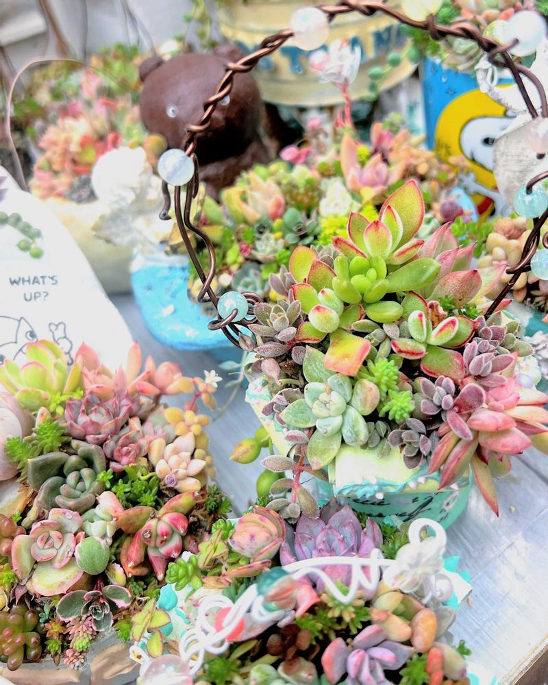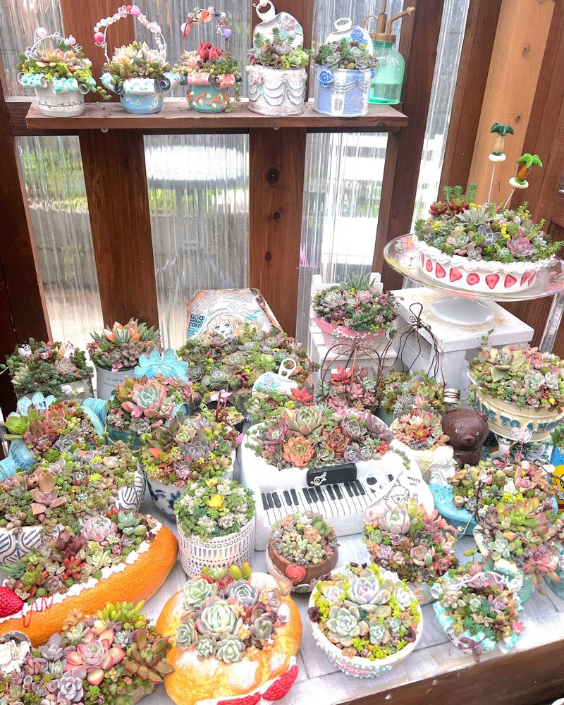 多肉ちゃんモリモリ沢山で可愛いですね😍中央のピアノ鉢めっちゃ可愛い🩷