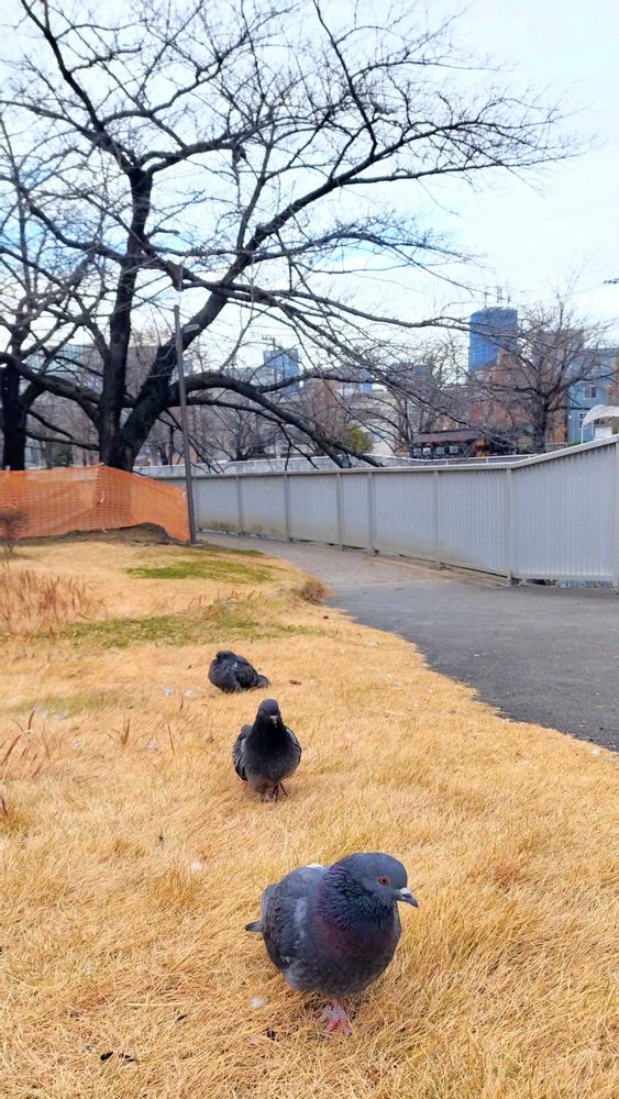 1列に並ぶ鳩が面白い😂それにしても…寒そうだねぇ〜😅💦💦