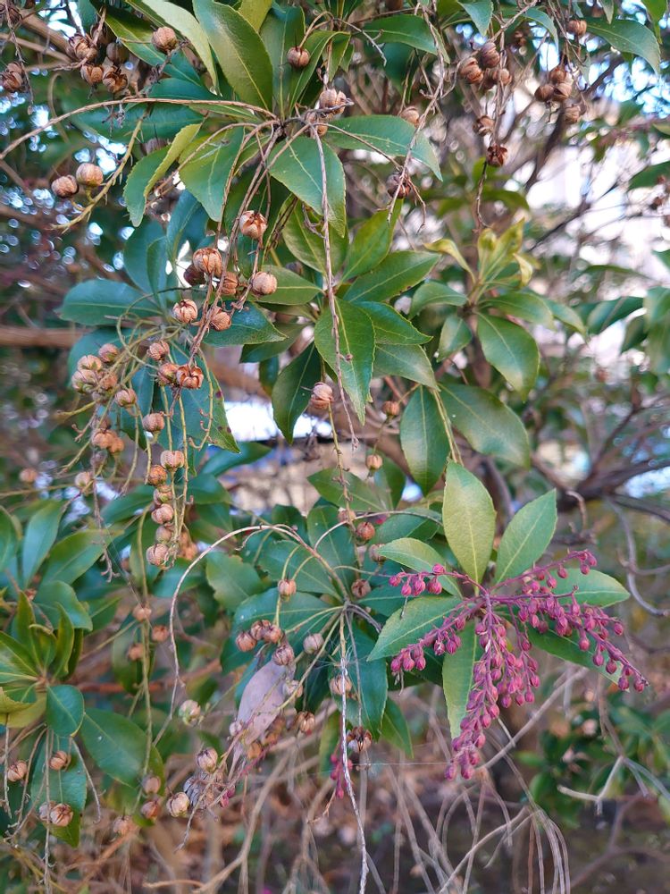 4️⃣5️⃣ベニバナアセビ 蕾が赤くなっています💕この実は不思議、春の花後にサーモンピンクの綺麗な実〜だんだん色褪せ緑に変化〜今は茶色に🟤鳥さんに食べてもらう作戦じゃないみたい🤔