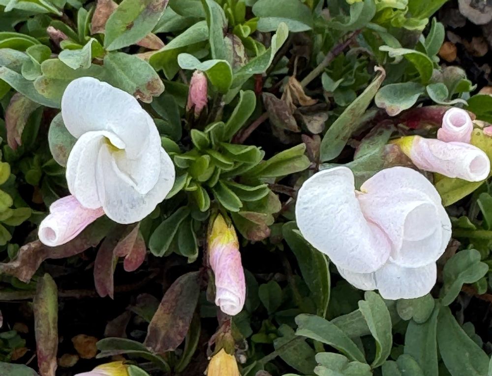 No.713 散歩道の植物とお散歩ちゃん12月①2025/1218白侘助、ビワ、オキザリスバーシカラー・・・