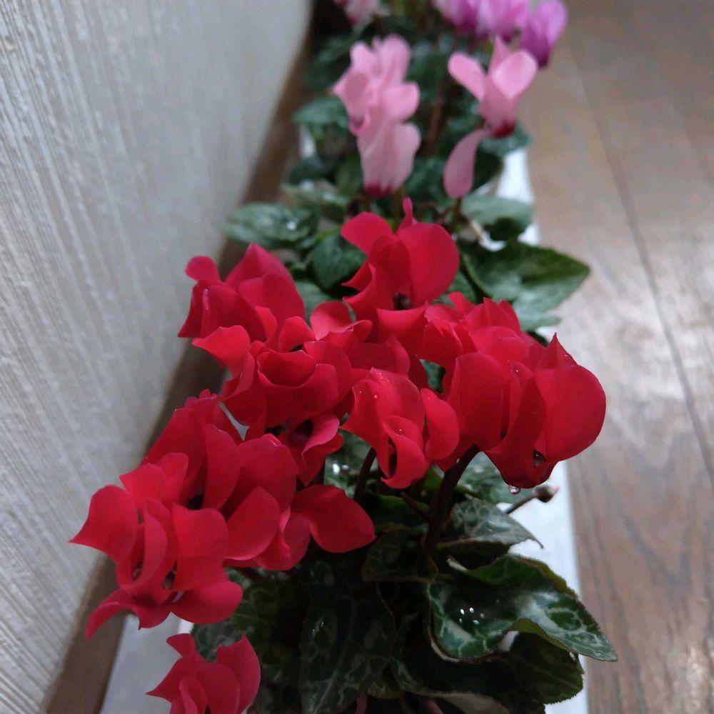 バラ咲きプリムラ、シクラメン、真っ赤なバラ🌹