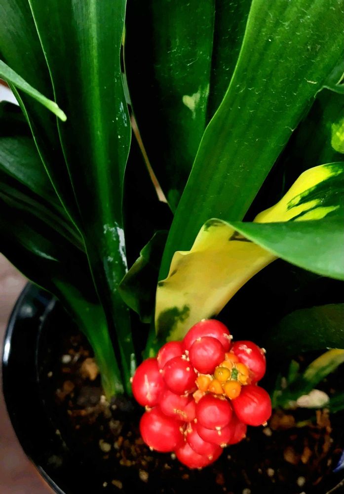 1枚目と2枚目は 斑入りの葉と赤いつやのある実がきれいな 宝船おもとです🌿
