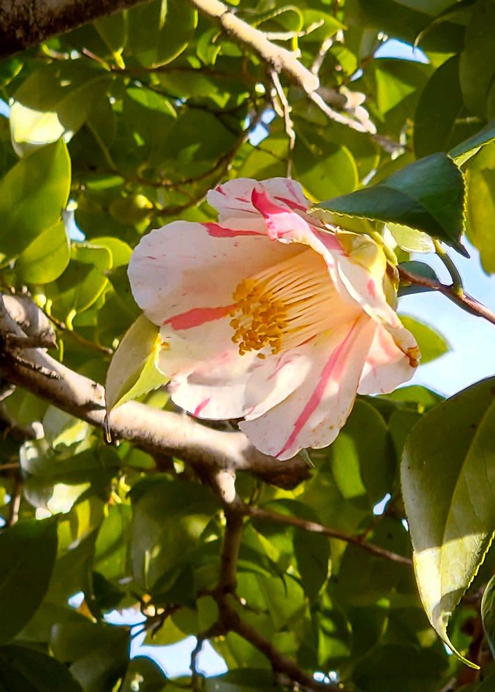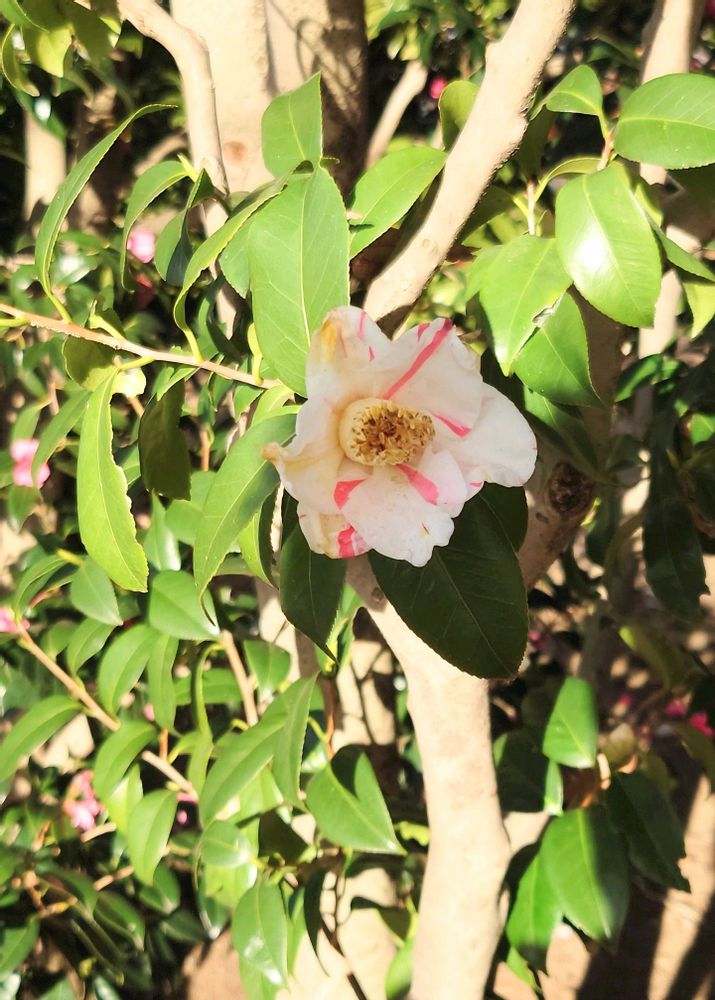 白地に赤い縦絞り👀 ちょっと見慣れないオシャレなツバキが咲いていました😀 小紅葉という種類のようです。正面から撮れなかったのが残念☹️ 機会を見て、再チャレンジします🫡