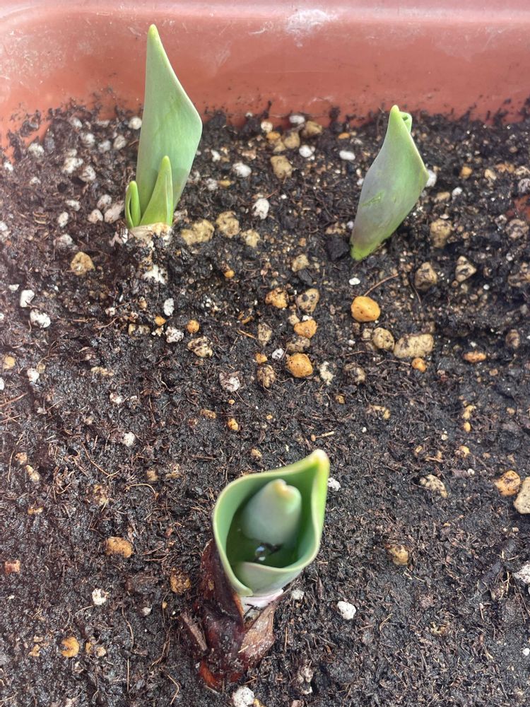 年末に植えた、砺波のチューリップの球根、芽がニョキっと出てきました🌷