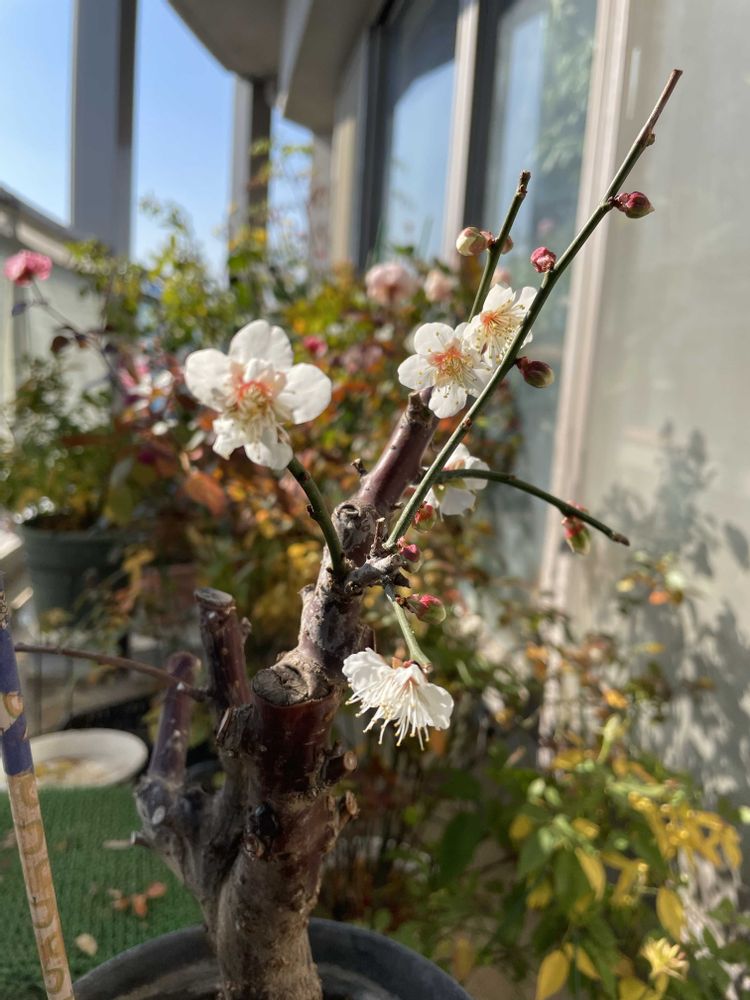 梅の鉢、去年は家の中に入れたら、あっという間に開いちゃったので、今年はベランダに置いて窓越しでしばらく楽しめそうです🥰