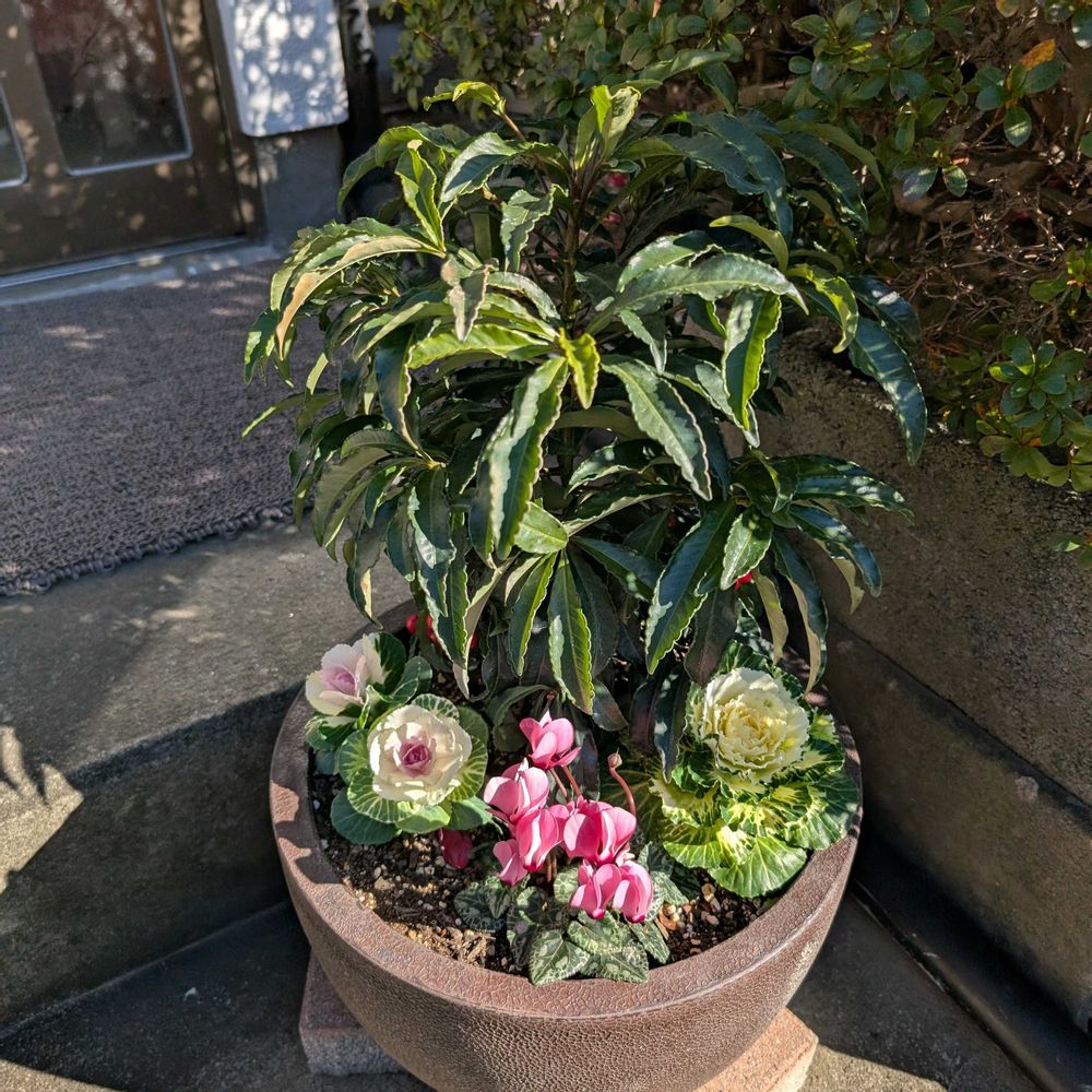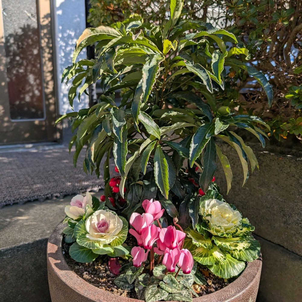 あらっ💓 寄せ植えの真ん中に ♥万両⚡ 葉牡丹とガーデンシクラメンがいいですね 今日私は万両を連れて来ました🥰 こちらはまだ寒いので 軒下です