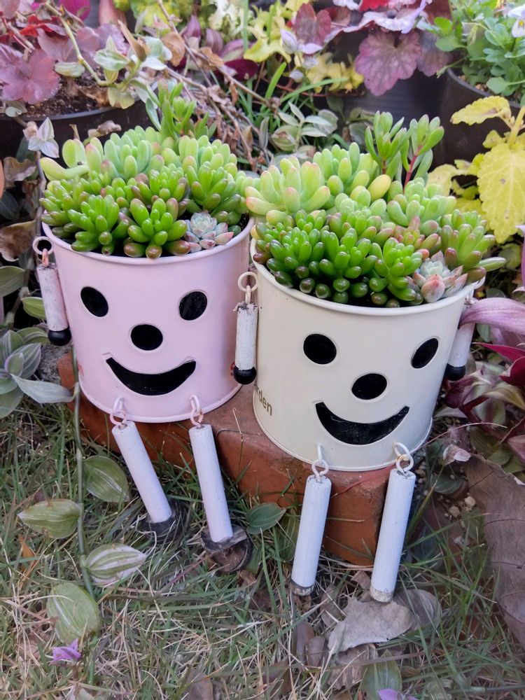 今朝の写真は、一昨年の夏の終わりに作りましたブリキマンポットくんたちの寄せ植えのその後になります。