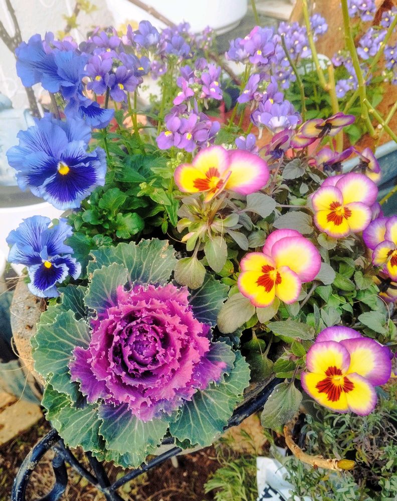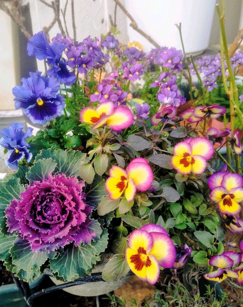 虹色スミレ色合い可愛いですね🎵葉牡丹もいい色🌹