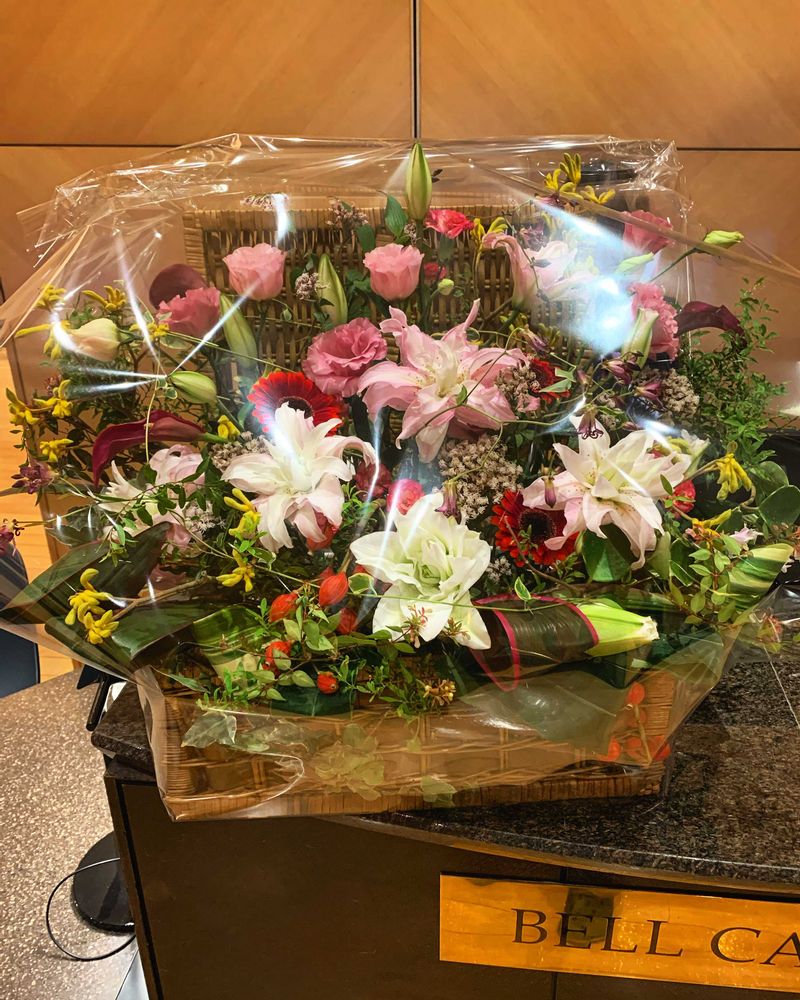ホテル日航様での会食パーティーにて サプライズでびっくりするような花をとのご依頼で 宝箱風の箱に色んな花を散りばめてみました。さてビックリしてくれたのでしょうか‥ご依頼ありがとうございましたm(__)m
