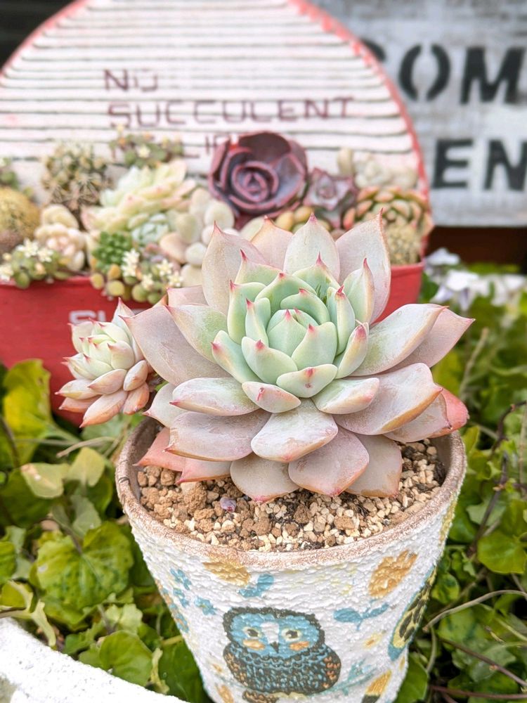 フクロウ鉢に優しい色合いのプリズムちゃんが似合うねぇ😍