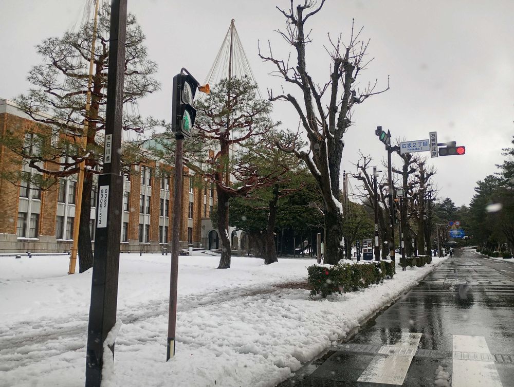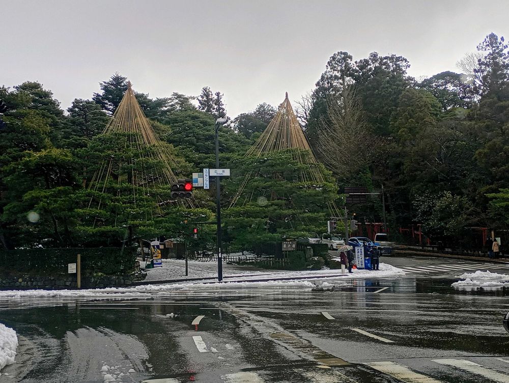 金沢城🏯、広坂交差点(兼六園近く)、市役所前(旧、四高記念館?)雪吊り🌳
