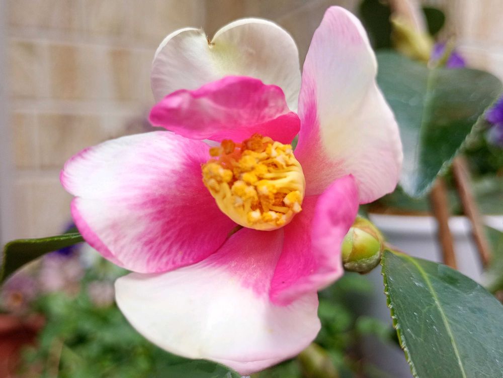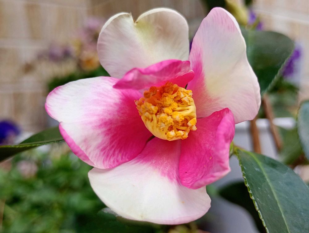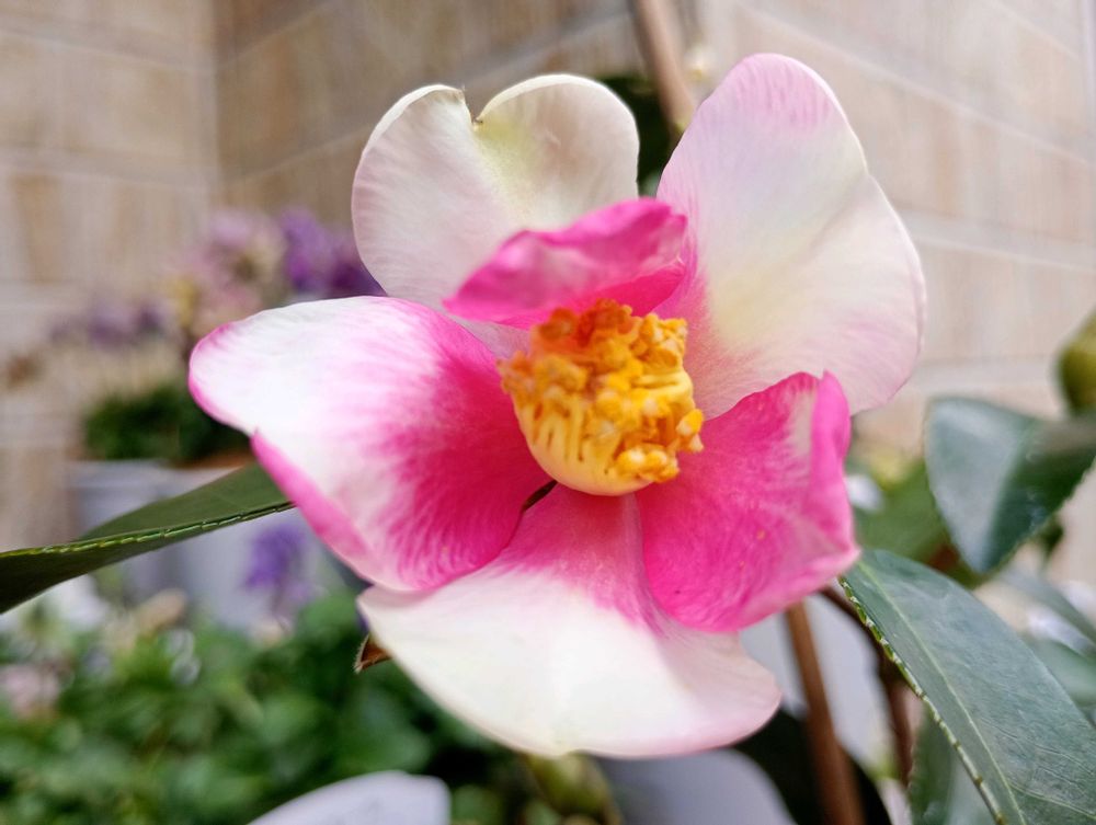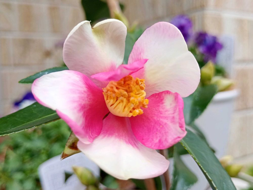 桃色と白の花弁が交互に並ぶように咲く、一重咲きで、桔梗咲き、筒しべ、中輪のツバキです。僅かに芳香があります。