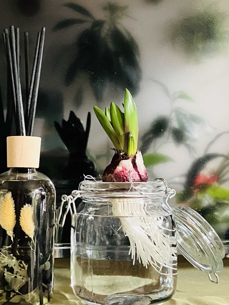 元はらっきょう漬けが目一杯入っていた瓶で頂き物ですがヒヤシンスの家にしました