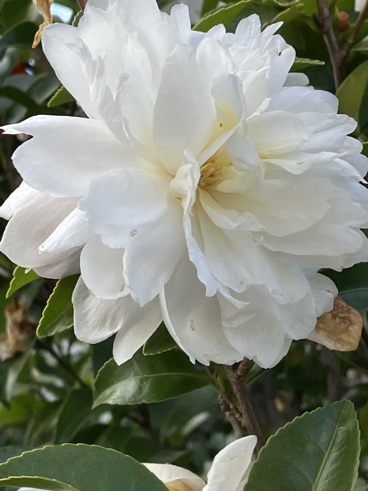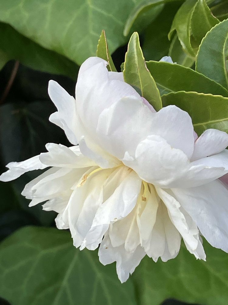 八重咲きの真っ白なサザンカ、寒空の中に、ひたむきに咲く姿は健気で美しいです🤍🌿