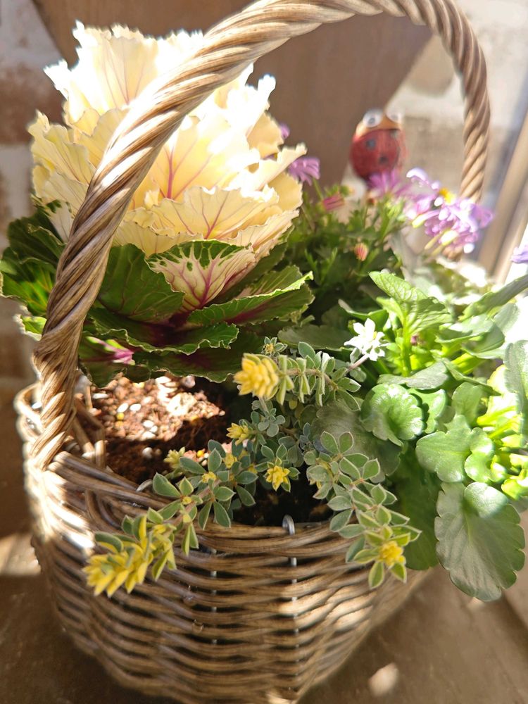 白い葉牡丹の葉脈もクッキリ。可愛いが詰まった寄せ植えです💓