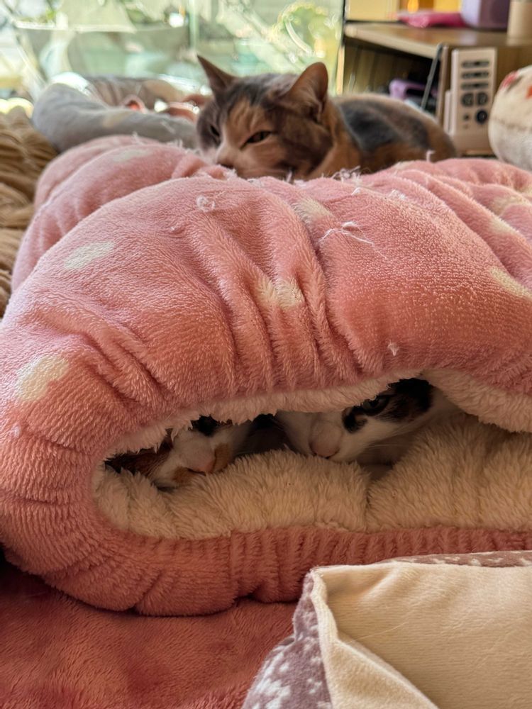 猫たち暖かいロールクッションがお気に入りでよくみんなで入ってます😸