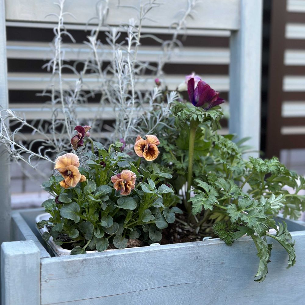 ベンチ型プランター、秋の花で作ってましたが、金魚草とエレモフィラが生き残っていたので補植で冬バージョンへ。