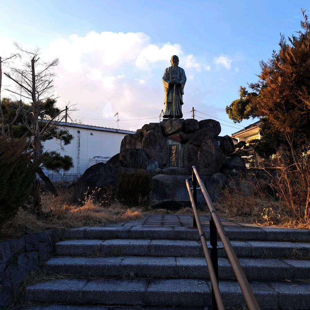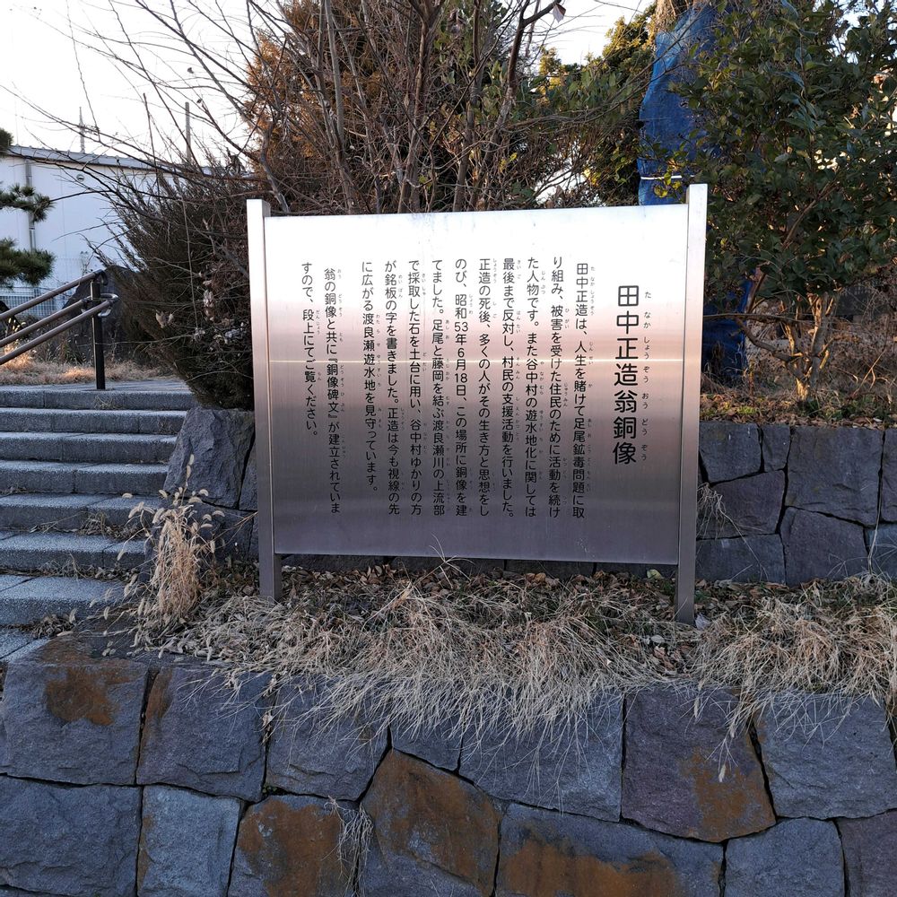 いつも漫然と通りすぎてしまう栃木市藤岡文化会館入口にある田中正造翁の銅像 2023年10/8に車の中から撮った遠景は投稿したこたがありました ただそこに行ったのは初めてであり翁の説明の立派なレリーフがあったりしました 以前の遠景の写真で写っていた桜はクビアカツヤカミキリの被害により全滅となってました(ある意味これも公害の一種であり、国を挙げて対処しなくてはならない事案ですよね) なので暗がりですが青い空が映えて写っています しかし桜においてはまったく残念ですね 鉱毒という人に厄災をもたらす公害、そこで企業、政府に体当たりしていった翁と農民たち… その事跡の顕彰は、未来においていついかなるときでも起こりうるであろう公害というものの現象の中で、輝きは増しどはすれ霞むことなどありますまい 昨今アメリカにてタール色素を食品に添加するのを禁じた報道がなされました しかしそれを右から左に受け流す日本人 霞んでしまったのは我関せずを決め込む日本人の感性なのでは?