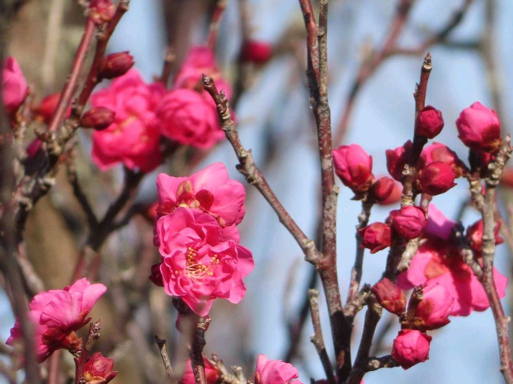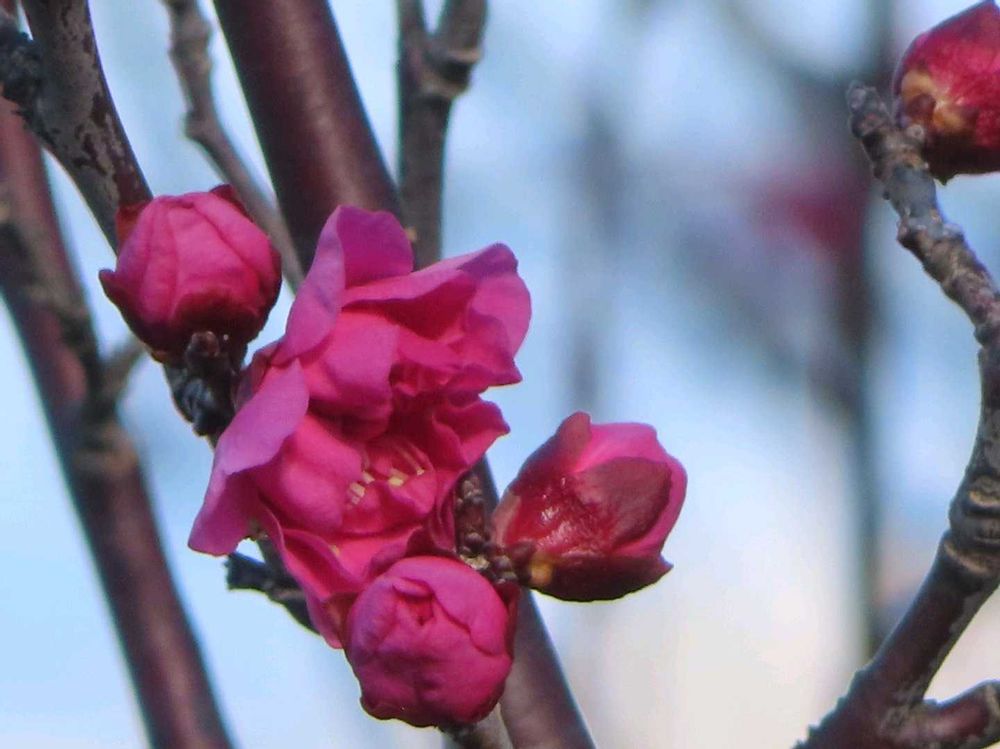 寒風吹き荒ぶなか、紅梅が初々しく咲き始めていました。