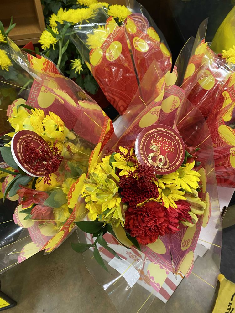 スーパーのお花売り場、赤とピンクであふれる中に、赤と黄色の一角が。中国の春節が1月19日なんですね。中国では新年より、旧暦の正月を盛大に祝うんですね🧧