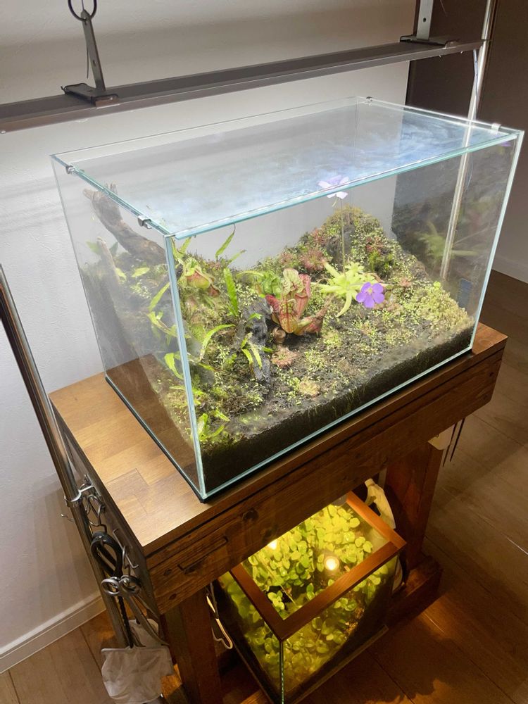 食虫植物テラリウムと水槽台、5、6年前に60cm水槽用に作ったけど奥行きが微妙に足りず45cm水槽を置くことになった水槽台、毎週の水換えが面倒になってテラリウムに、霧吹き以外のメンテナンスは不要です。時々気が向いたらガラスを激落くんするくらい。