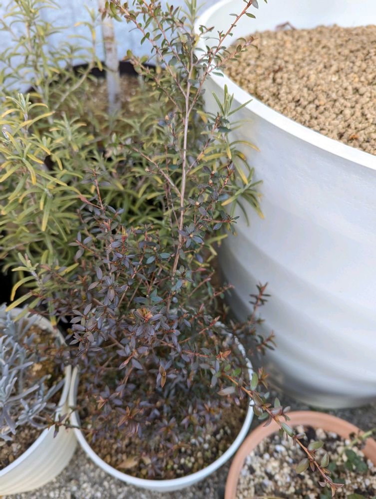 マヌカの苗が寒い中でも枯れずに蕾が付きました。同じ土に植えて同じ水やりをしているのに他の2鉢は枯らしてしまいました。植え方の問題だったのかもしれません。