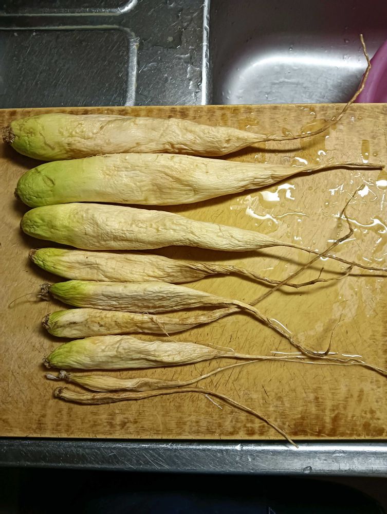 ②間引きした小さい大根を外に置いててなんちゃって寒干し大根にした。根っこの爪楊枝くらいの細いところも全部使い、山川漬け風に漬物にした。