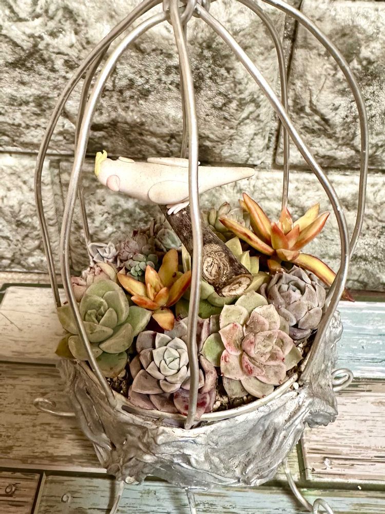 自作の鳥かご鉢の寄せ植えを少し手直ししました。
