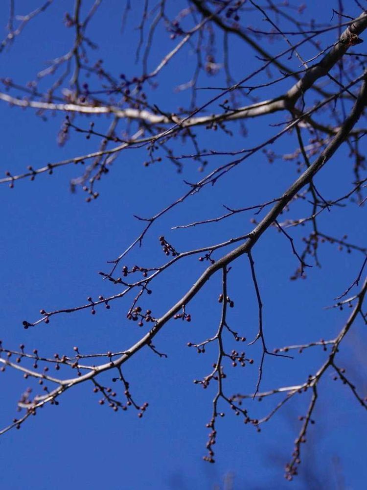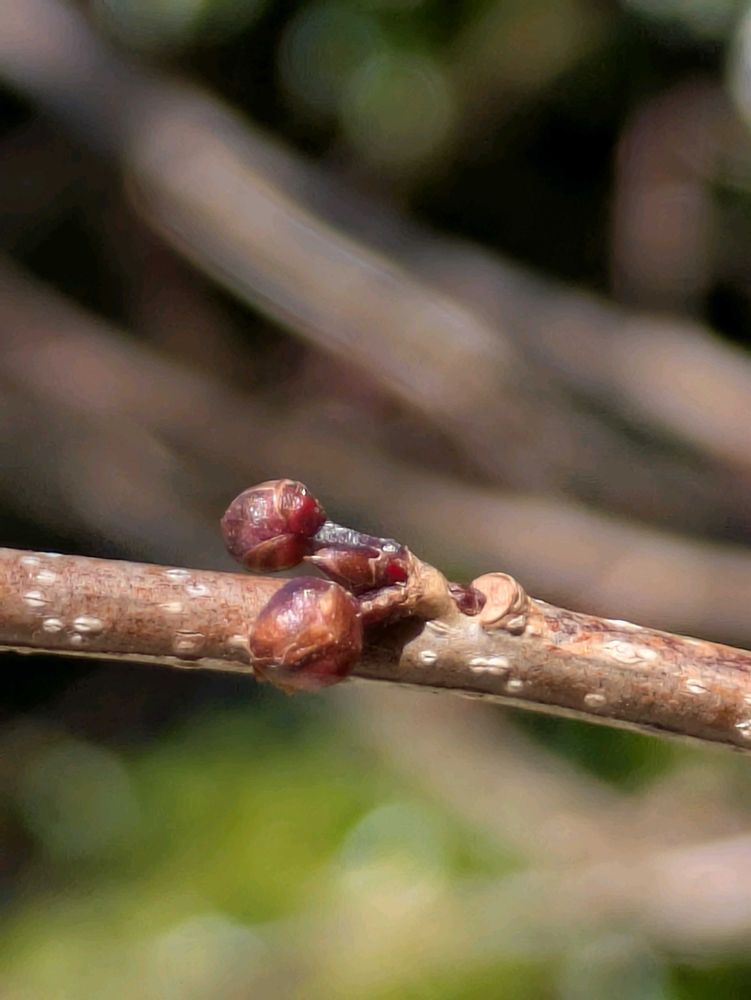 2枚目2つの丸いのは蕾のようです。その真ん中に冬芽。その下にふっくらした三日月状の葉痕が見えました。